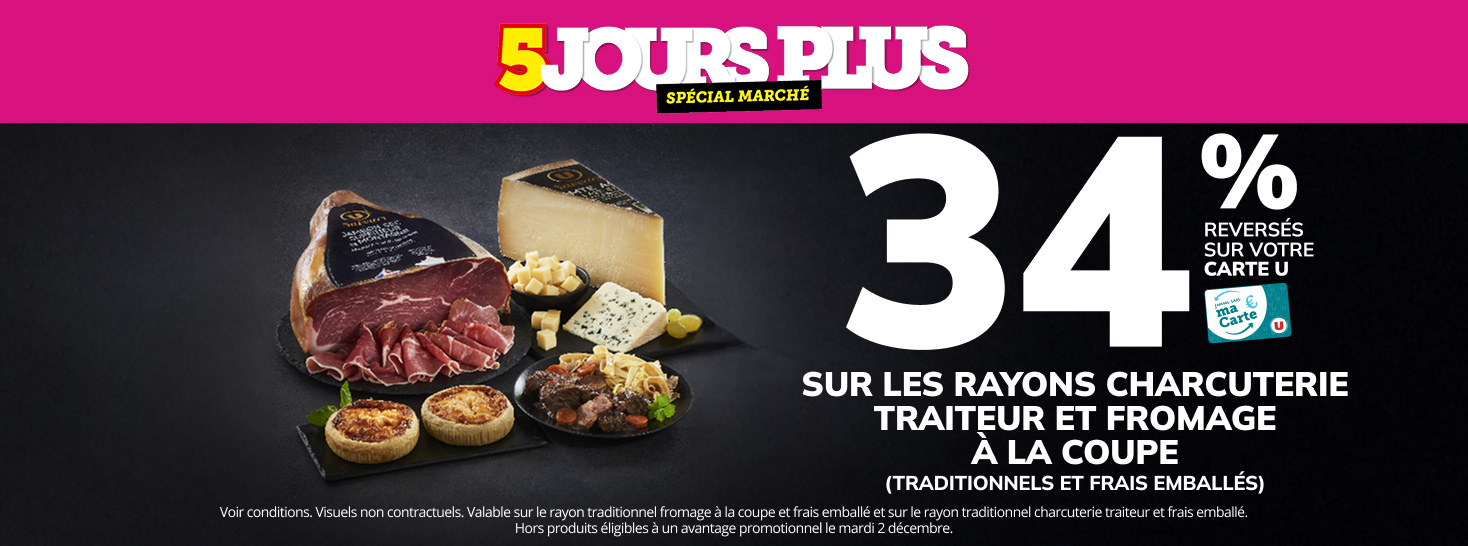 Valable sur le rayon traditionnel fromage à la coupe et frais emballé et sur le rayon traditionnel charcuterie traiteur et frais emballé. Hors produits éligibles à un avantage promotionnel le mardi 02 décembre 2025. Offre réservée aux clients Carte U dans les Magasins U participants de France métropolitaine et sur coursesu.com pour un retrait le 02 décembre 2025.