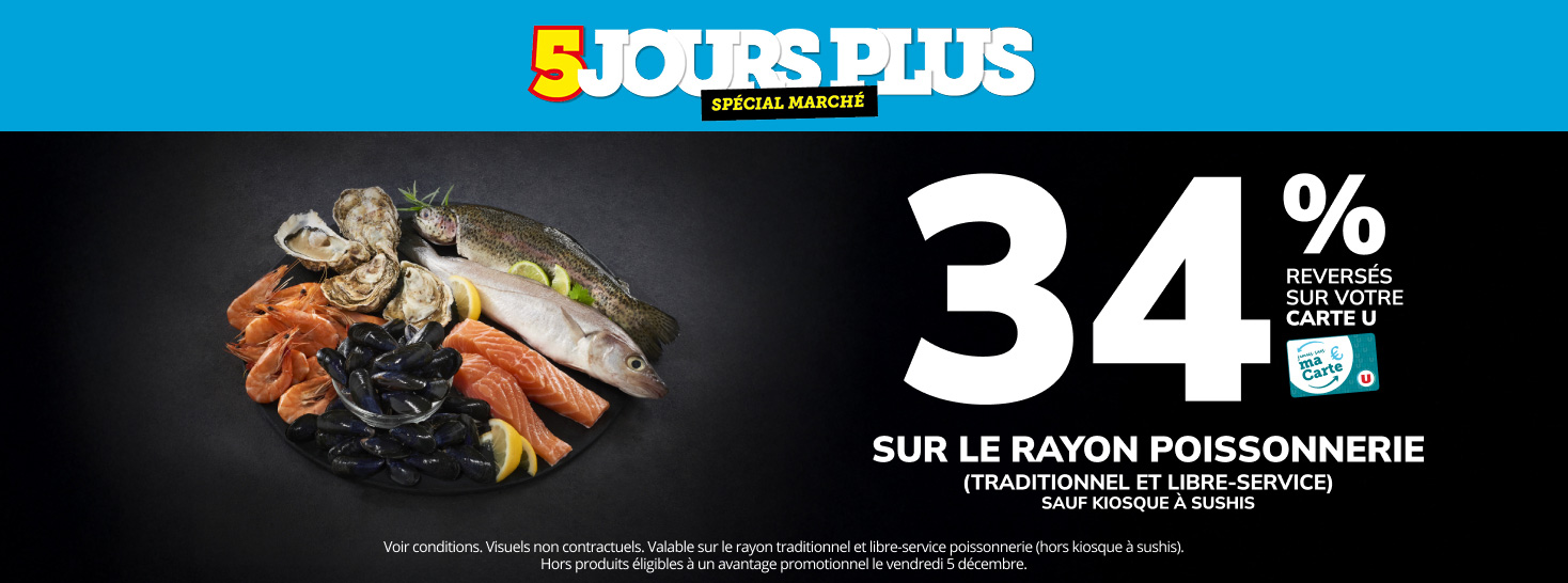 Valable sur le rayon traditionnel et libre-service poissonnerie (hors kiosque à sushis). Hors produits éligibles à un avantage promotionnel le vendredi 5 décembre 2025. Offre réservée aux clients Carte U dans les Magasins U participants de France métropolitaine et sur coursesu.com pour un retrait le 5 décembre 2025.