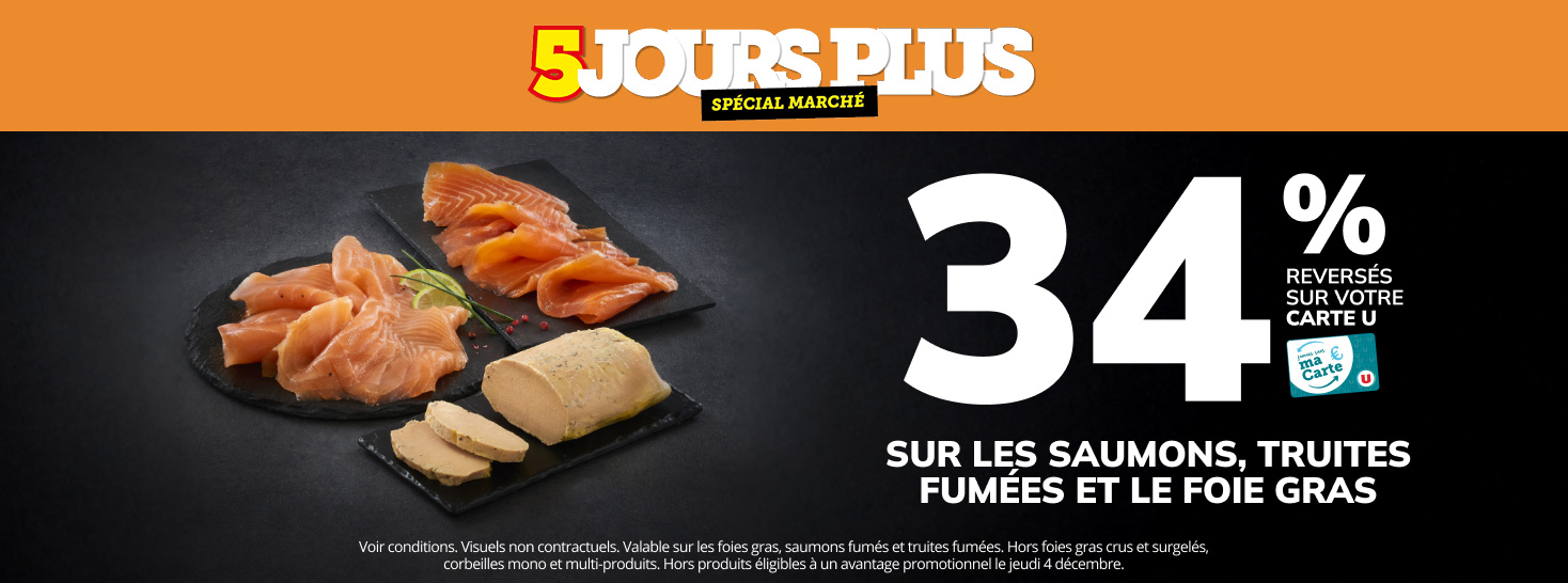 Valable sur les foies gras, saumons fumés et truites fumées. Hors foies gras crus et surgelés, corbeilles mono et multi-produits. Hors produits éligibles à un avantage promotionnel le jeudi 04 décembre 2025. Offre réservée aux clients Carte U dans les Magasins U participants de France métropolitaine et sur coursesu.com pour un retrait le 04 décembre 2025.