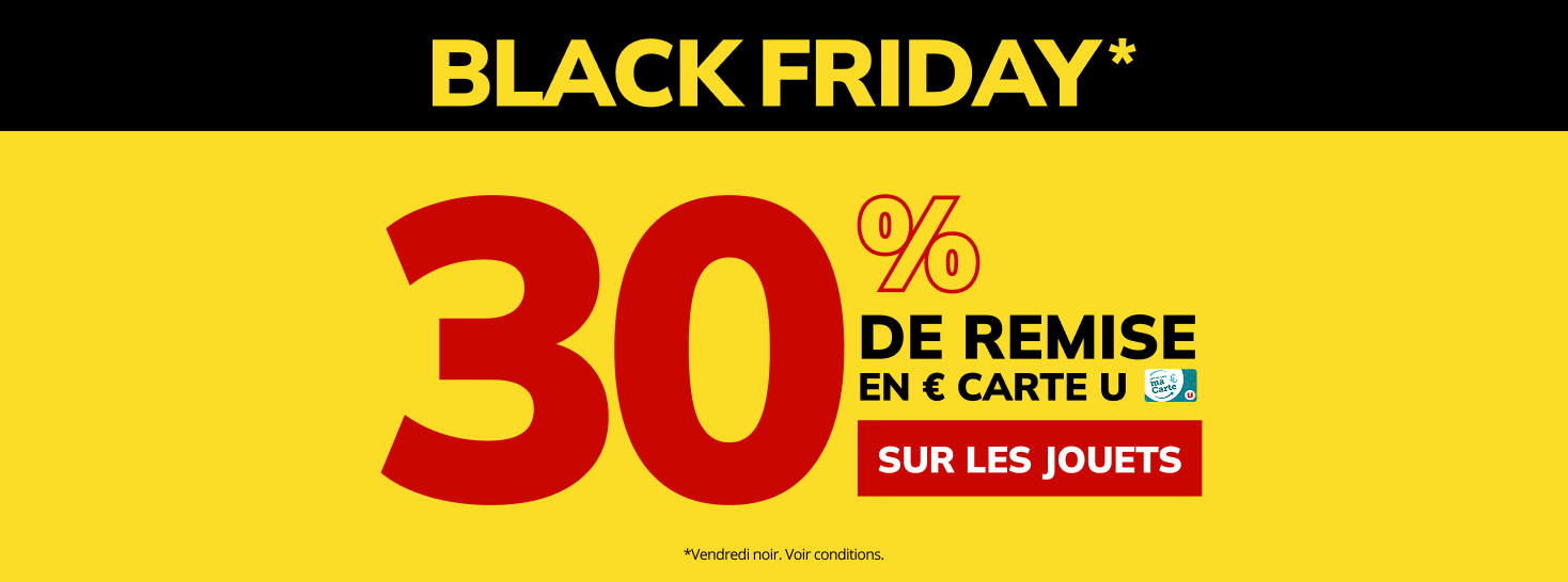 * Le vendredi 28 novembre 2025, bénéficiez de 30% en € Carte U pour l'achat de produits du rayon jouets (hors PELUCHE OURS OU KOALA OU HIPPOPOTAME 100cm, sport cycles, jeux vidéos, consoles de jeux, livres et mobilier/déco enfant). Offre réservée aux clients particuliers Carte U, valable dans les Magasins Hyper U participants de France métropolitaine et sur coursesu.com pour les achats retirés en drive ou livrés le 28 novembre, dans la limite des stocks disponibles. Offre cumulable avec les promotions en cours.