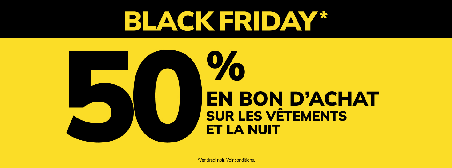 * Vendredi Noir. Offre valable vendredi 28 novembre, uniquement sur les vêtements et la nuit incluse. Hors chaussures d'extérieur et d'intérieur, linge de maison, accessoires de l'habillement, bain, chaussettes, collants, mercerie, sous-vêtements, puériculture, semelles/lacets, bijouterie, produits d'occasion, promotions en cours et hors produits signalés en magasin. Offre réservée aux clients Carte U dans les Magasins U participants à l'animation et au programme de fidélisation.