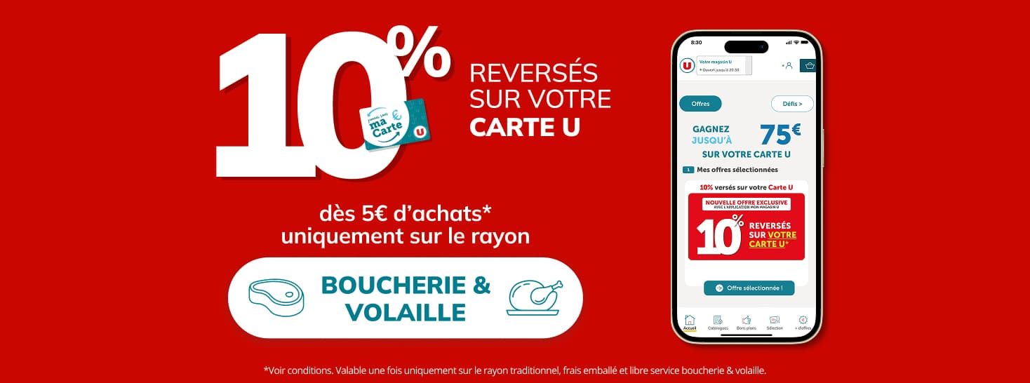 Dès 5€ d'achats, sur présentation de la Carte U en magasin ou sur coursesu.com du 27 octobre au 02 novembre 2025 (jour de retrait ou de livraison), bénéficiez de 10 % en euro Carte U sur le rayon traditionnel, frais emballé et libre service boucherie & volaille pour un montant cagnotté maximum de 200€. Offre valable exclusivement en France métropolitaine (hors DROM-COM et Utile) dans les magasins participants disposant du rayon concerné par l’offre. Valable une seule fois par compte Carte U lors du premier passage en caisse après l'activation de l'offre. Le montant cagnotté sera visible dans un délai de 1 à 3 jours sur votre espace fidélité. Voir conditions sur magasins-u.com.