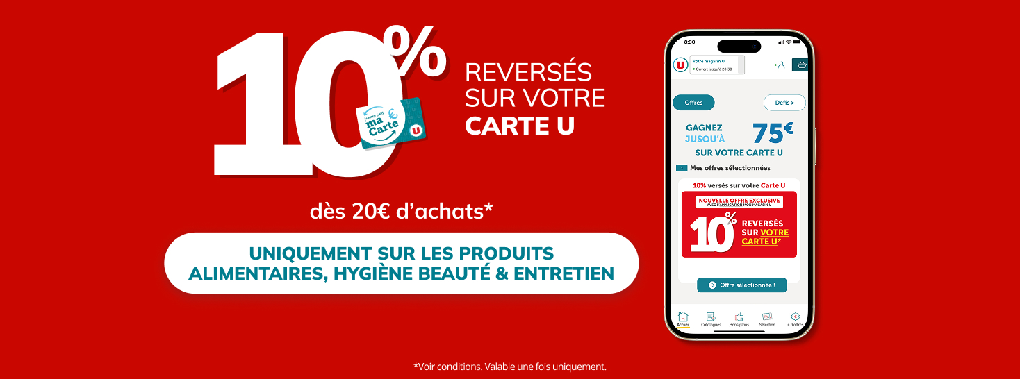 Dès 20€ d'achats sur présentation de la Carte U en magasin ou sur coursesu.com les 21 et 22 novembre 2025 (jour de retrait ou de livraison), bénéficiez de 10 % en euro Carte U sur les produits alimentaires, hygiène beauté et entretien (hors vins, alcools, textiles, équipement de la maison, culture, bricolage, jardinage, loisirs, fleurs et plantes, carburant, gaz, livres, presse et carte cadeau U) pour un montant cagnotté maximum de 200€. Offre valable en France métropolitaine (hors DROM-COM et Utile) dans les magasins participants. Valable une seule fois par compte Carte U lors du premier passage en caisse après l'activation de l'offre. Le montant cagnotté sera visible dans un délai de 1 à 3 jours sur votre espace fidélité. Voir conditions sur magasins-u.com.