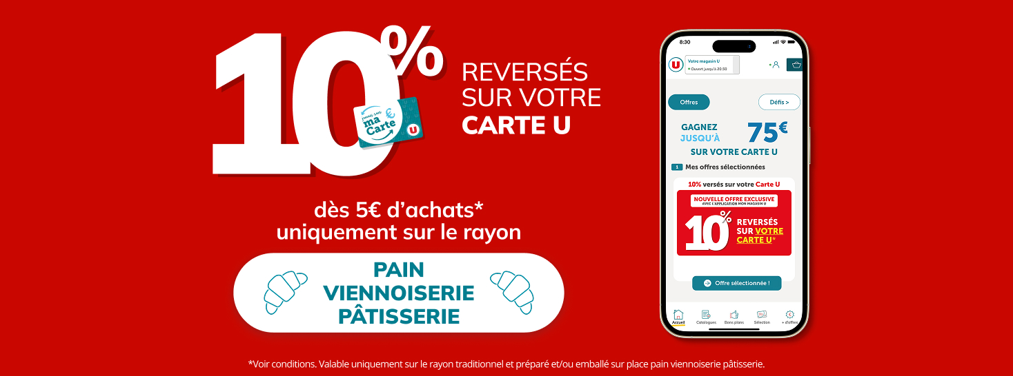 Dès 5€ d'achats sur présentation de la Carte U en magasin ou sur coursesu.com du 24 et 30 novembre 2025 (jour de retrait ou de livraison), bénéficiez de 10 % en euro Carte U sur le rayon traditionnel et préparé et/ou emballé sur place pain viennoiserie pâtisserie pour un montant cagnotté maximum de 200€. Offre valable exclusivement en France métropolitaine (hors DROM-COM et Utile) dans les magasins participants disposant du rayon concerné par l’offre. Valable une seule fois par compte Carte U lors du premier passage en caisse après l'activation de l'offre. Le montant cagnotté sera visible dans un délai de 1 à 3 jours sur votre espace fidélité. Voir conditions sur magasins-u.com.