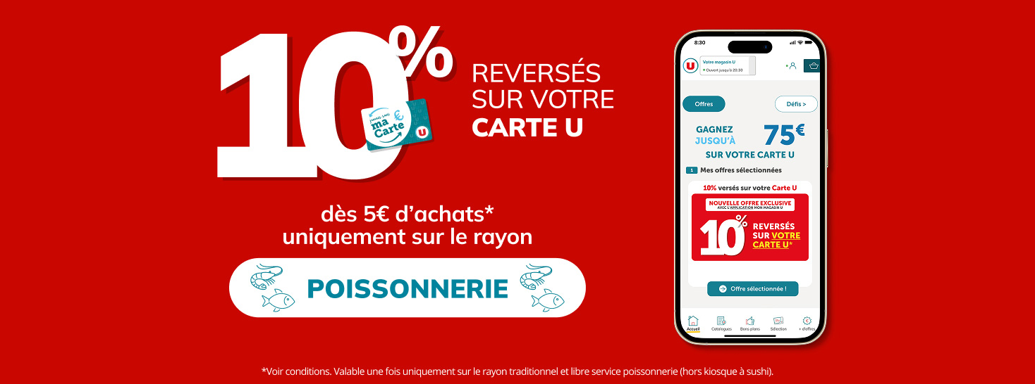 Dès 5€ d'achats, sur présentation de la Carte U en magasin ou sur Courses U. du 10 au 16 novembre 2025 (jour de retrait ou de livraison), bénéficiez de 10 % en euro Carte U sur le rayon traditionnel et libre service poissonnerie (hors kiosque à sushi) pour un montant cagnotté maximum de 200€. Offre valable exclusivement en France métropolitaine (hors DROM-COM et Utile) dans les magasins participants disposant du rayon concerné par l’offre. Valable une seule fois par compte Carte U lors du premier passage en caisse après l'activation de l'offre. Le montant cagnotté sera visible dans un délai de 1 à 3 jours sur votre espace fidélité. Voir conditions sur Magasin U .