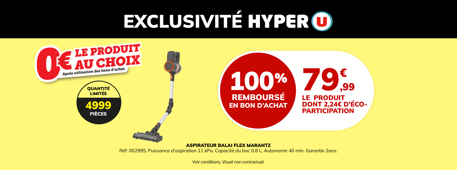 Dans la limite de 4499 pièces dans les magasins participants. Offre 100% remboursée en bon d'achat, limitée a 2 produits par jour. Bon d'achat utilisable 15 jours à compter du lendemain de la date d'émission dans le magasin émetteur (hors coursesu.com, gaz, carburant, livres, presse, services et cartes cadeaux). Le bon d'achat est cumulable avec d'autres bons d'achat, non remboursable, non compensable en tout ou partie et utilisable en une seule fois pour un montant d'achat supérieur ou égal à la valeur totale des bons d'achat utilisés.