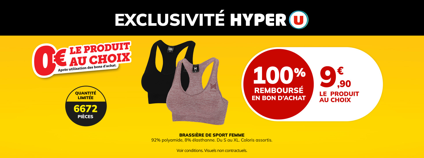 Offre 100% remboursé en bon d'achat valable 15 jours à compter du lendemain de la date d'émission dans le magasin émetteur (hors coursesu.com, gaz, carburant, livres, presse, services et cartes cadeaux). Ce bon d'achat est cumulable avec d'autres bons d'achat, non remboursable, non compensable en tout ou partie et utilisable en une seule fois pour un montant d'achat supérieur ou égal à la valeur totale des bons d'achat utilisés. Limité à 2 produits par jour. Sur les quantités réparties sur l'ensemble des magasins Hyper U participants.