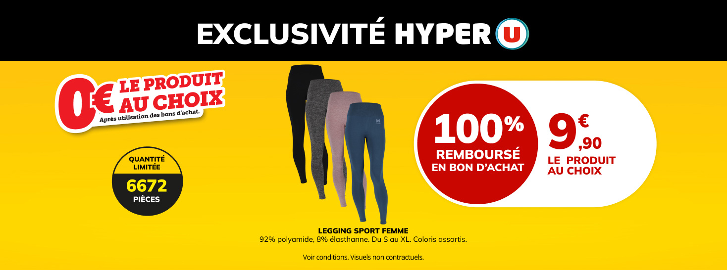 Profitez de cette exclusivité ! Le 14 et le 15 novembre uniquement, le legging de sport femme est 100% remboursé en bon d’achat. Ne tardez pas, les quantités sont limitées : seulement 6672 pièces. Rendez-vous vite en magasin ! Voir conditions.