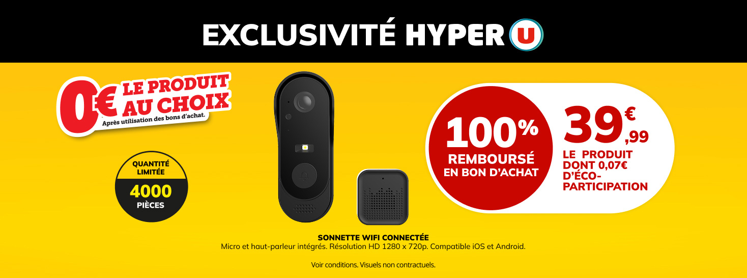 Profitez de cette exclusivité ! Le 14 et le 15 novembre uniquement, la sonnette wifi est 100% remboursé en bon d’achat. Ne tardez pas, les quantités sont limitées : seulement 4000 pièces. Rendez-vous vite en magasin ! Voir conditions.