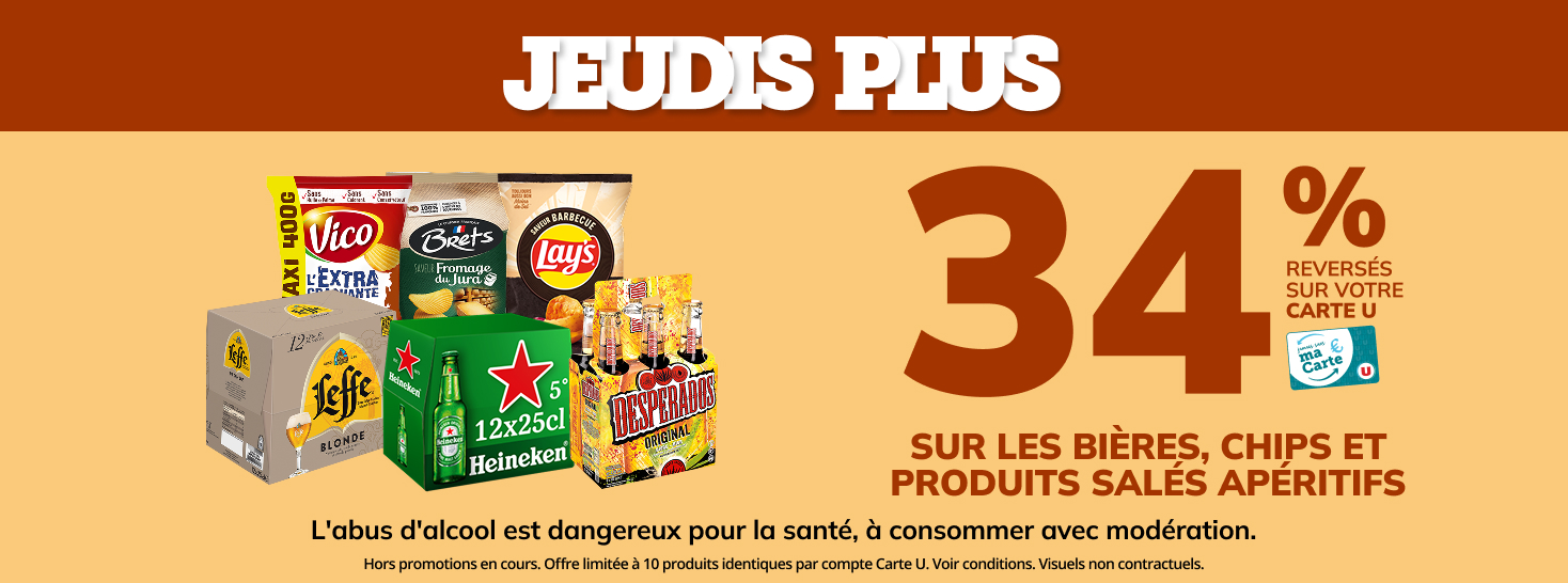 Ce jeudi 21 août uniquement, profitez de 34% reversés sur votre Carte U sur les bières, les chips et les produits salés apéritifs. C’est le bon moment pour faire le plein d'économies ! Rendez-vous dans votre Magasin U ou sur coursesu.com pour en profiter.