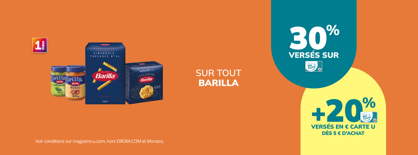 Jusqu’au 19 octobre, bénéficiez de 20% supplémentaires en euros Carte U dès 5€ d’achats sur tous les produits Barilla signalés en magasin. Non cumulable avec d’autres promotions. Voir conditions.