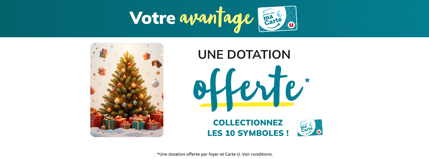 *Offre réservée aux Clients Carte U et aux personnes majeures, du lundi 24/11 au dimanche 21/12/2025 (selon jour d'ouverture de votre magasin), un symbole attribué par tranche de 50€ lors d'un passage en caisse, effectuée en une seule fois (hors courses U, gaz, carburant, presse, livres, cafétéria, services et cartes cadeaux) sur présentation de la Carte U. Pour 10 symboles collectionnés dans un même magasin, recevez une dotation. Offre valable dans les Magasins U participants (liste consultable à l'accueil du magasin et sur www.magasins-u.com). Offre limitée à une dotation par foyer et par Compte Carte U, dans la limite des stocks disponibles. À retirer au plus tard le dimanche 28 décembre 2025 selon les modalités indiquées par le magasin émetteur de l'offre sur présentation de la Carte U et des 10 symboles collectionnés (ayant le même numéro Carte U). Offre non échangeable et non remboursable en totalité ou partie.