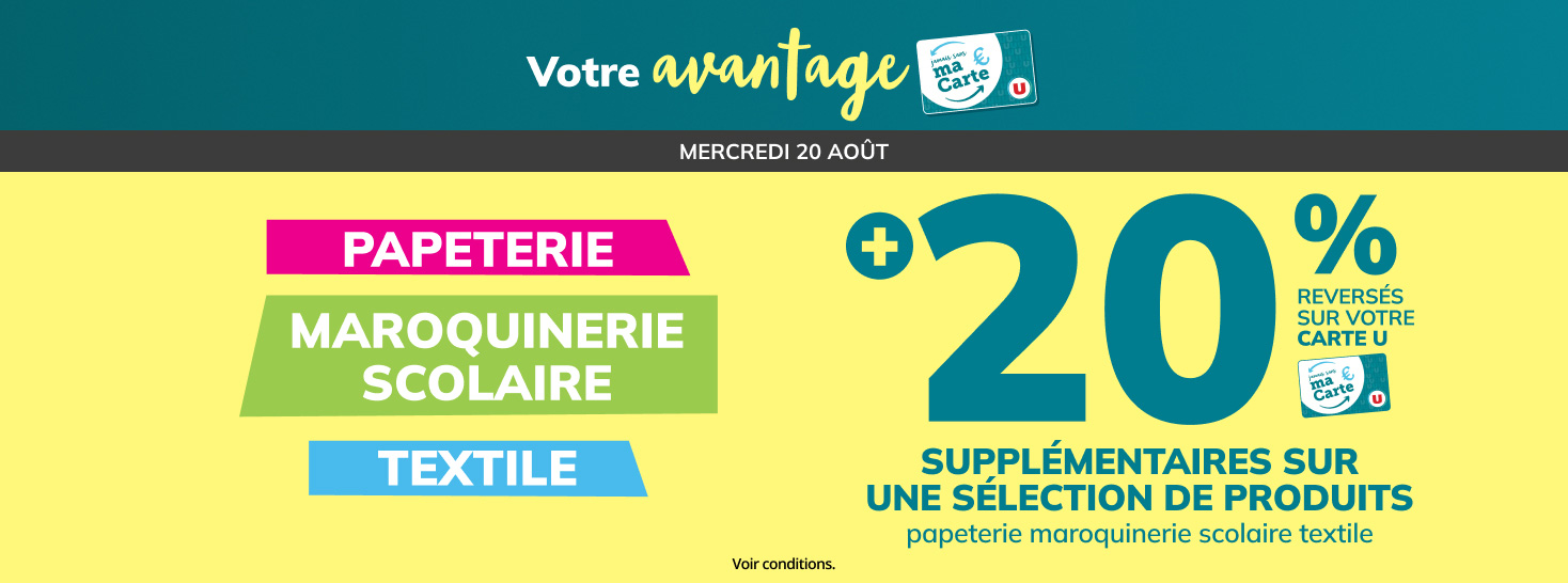 Votre rentrée à prix bas ! Bénéficiez de 20 % en € Carte U supplémentaires pour l’achat de produits textile, papeterie, calculatrices et maroquinerie scolaire. Voir conditions.