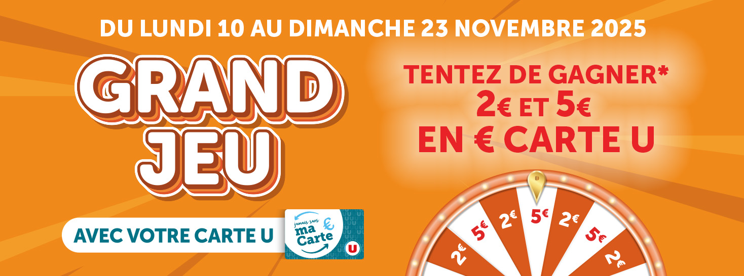 *Voir le règlemen. Jeu avec obligation d’achat et sur présentation d’une Carte U valide, ouvert aux personnes physiques majeures, du 10 au 23 novembre 2025 (ou le samedi 22 novembre 2025 selon ouverture des Magasins U participants). Offre valable dans les Magasins U participants dont la liste est accessible sur www.magasins-u.com. Pour participer le client reçoit, sur présentation d’une Carte U valide lors de son passage en caisse, un jeton pour un montant minimum d’achat de 30€ (le montant d’achat s’entend hors gaz, carburant, livres, presse, services et Carte Cadeau U). Le participant doit introduire le jeton obtenu dans la borne électronique présente en magasin pendant la période du jeu. Les bornes de jeu distribuent des bons de 2 € et 5 € Carte U selon le principe des instants gagnants prédéfinis. S’il gagne, le participant reçoit un ticket gagnant sur lequel est indiquée la valeur du bon. Le gagnant devra se présenter à l’accueil de son magasin U participant à l’opération, muni de son ticket gagnant, de sa Carte U et d’une pièce d’identité afin de créditer le montant gagné en euros Carte U et ce dès le jour de l’émission du ticket gagnant. Le bon est valable jusqu’au dimanche 30 novembre (ou samedi 29 novembre selon ouverture magasin). La participation à ce jeu vaut acceptation du règlement GRAND JEU disponible sur le site www.magasins-u.com et à l’accueil des Magasins U participants.