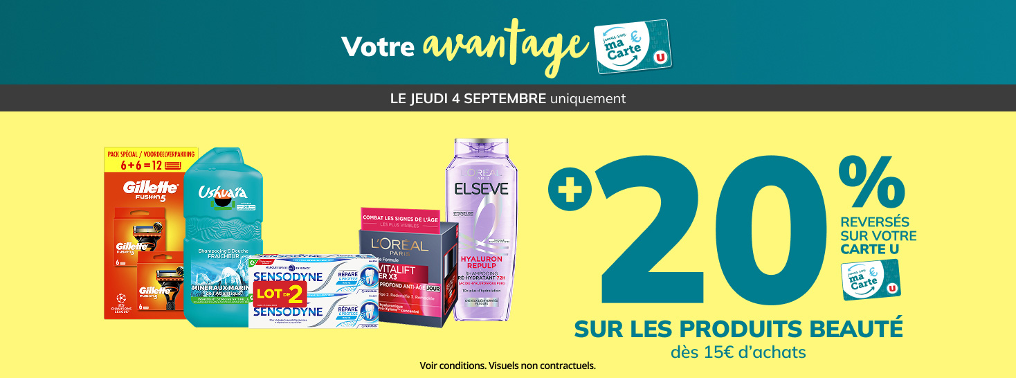 Dès 15 € d'achats sur les produits "spécial beauté" signalés sur sur ce prospectus, bénéficez de 20% en euros Carte U sur ces produits. Les € Carte U sont utilisables uniquement à partir du vendredi 05 septembre 2025. Offre valable une seule fois par compte Carte U, dans la limite des stocks disponibles.