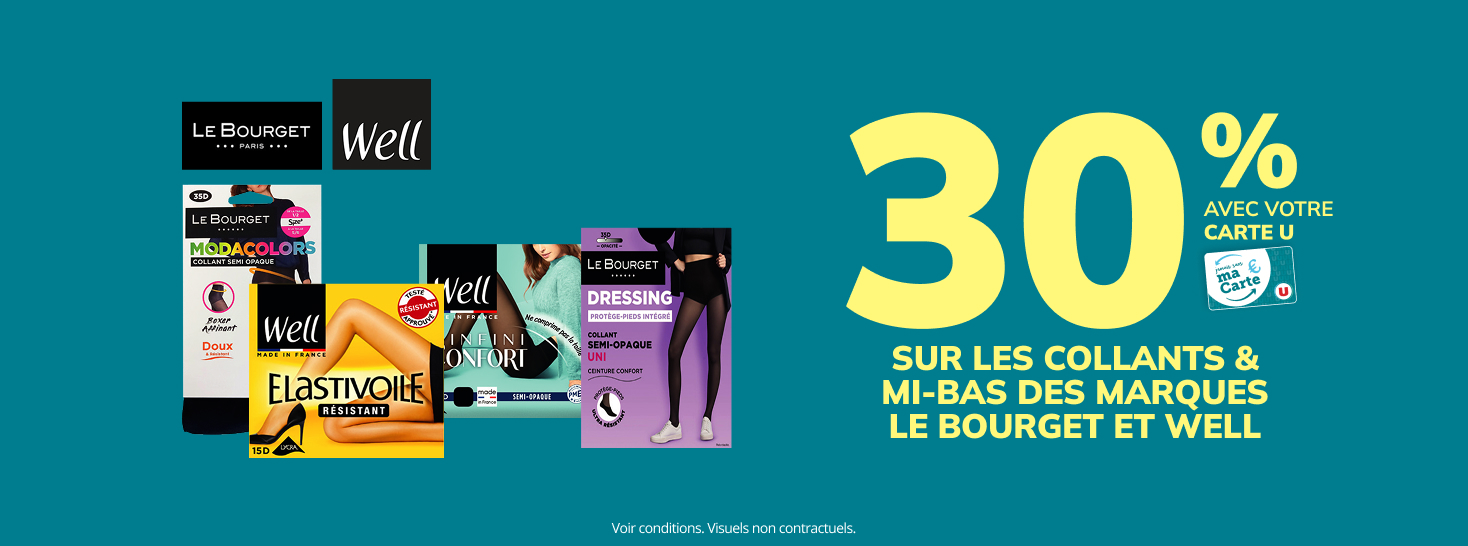 Offre réservée aux clients Carte U pour l’achat de collants et mi-bas Well et Le Bourget disponibles en magasin, dans les magasins participants. Hors gammes Well : Allure d’Hiver et Magic Night, hors promotion en cours et formats promotionnels. Visuels non contractuels.