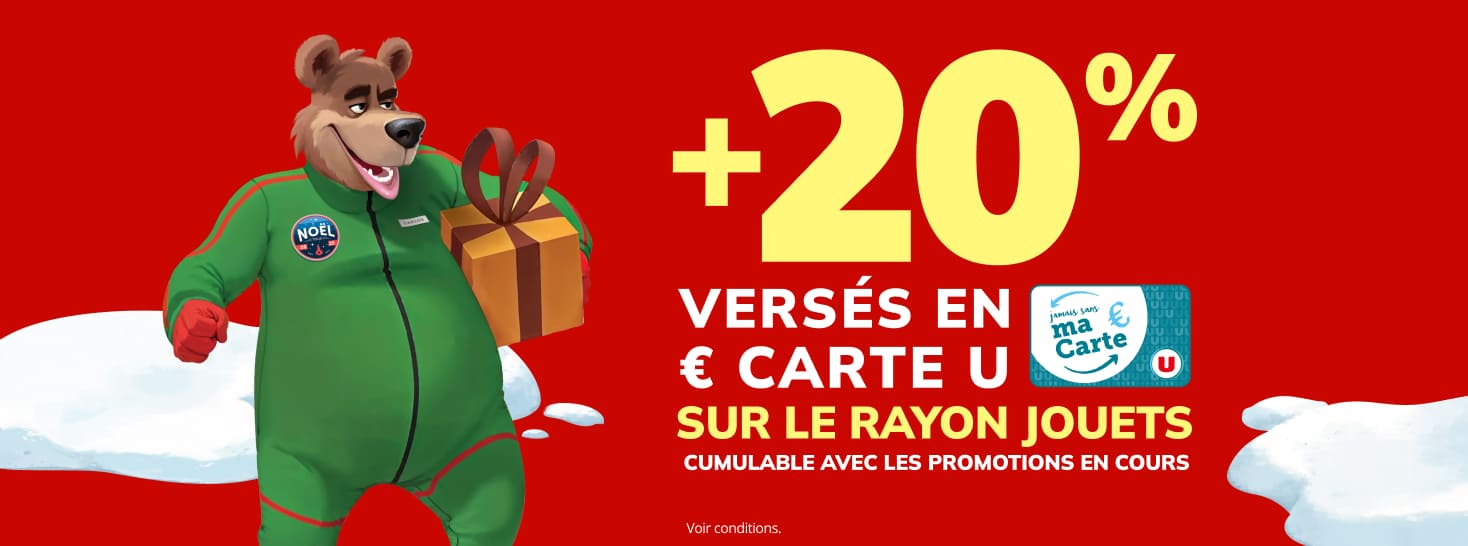 Le vendredi 7 novembre 2025, bénéficiez de 20 % en € Carte U pour l'achat de produits du rayon jouets (hors sport cycles, jeux vidéos, consoles de jeux, multimédia, livres et mobilier/décoration enfant). Offre réservée aux clients particuliers Carte U, valable dans les Magasins participants et sur Courses U pour un retrait le 7 novembre 2025, dans la limite des stocks disponibles. Offre cumulable avec les promotions en cours. Voir conditions et liste des magasins participants sur magasins-u.com.